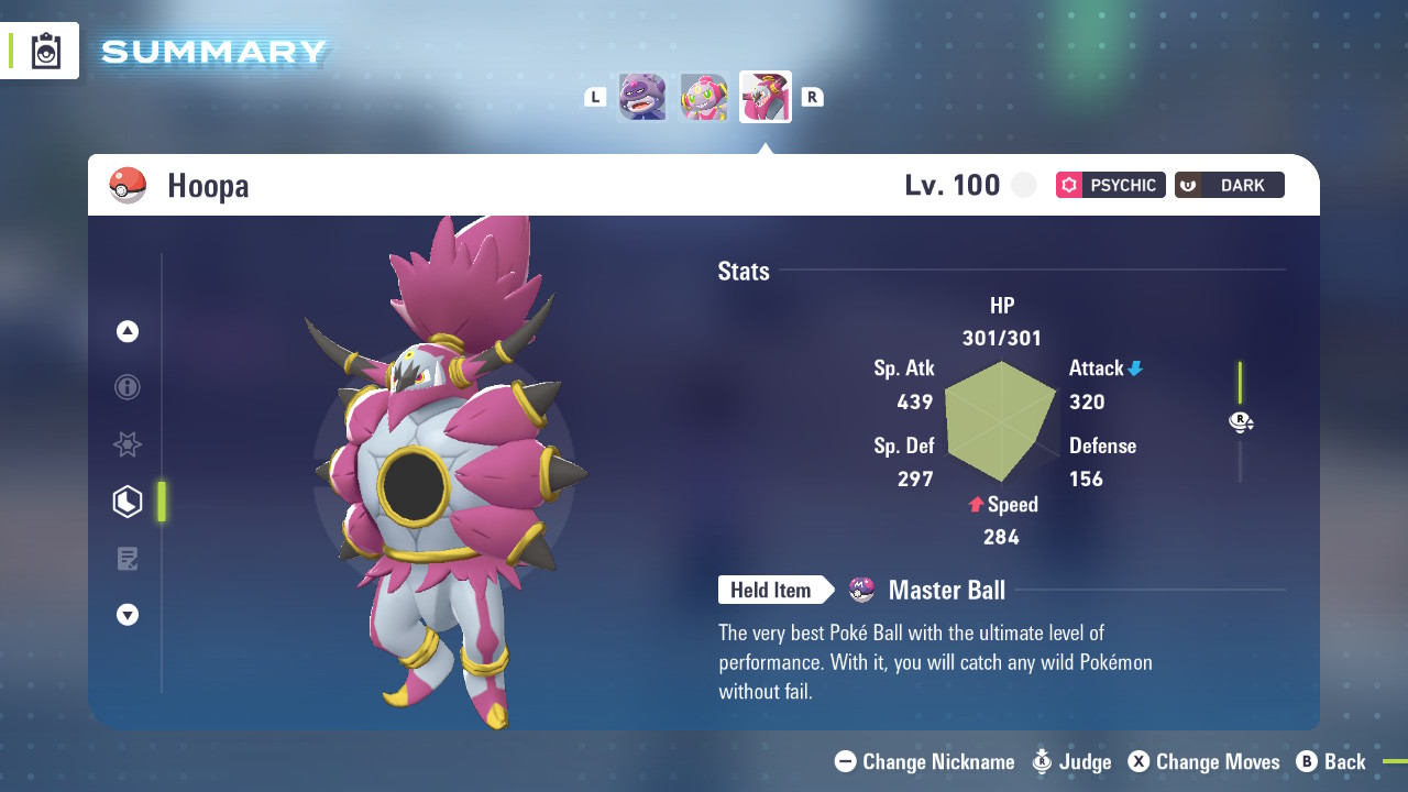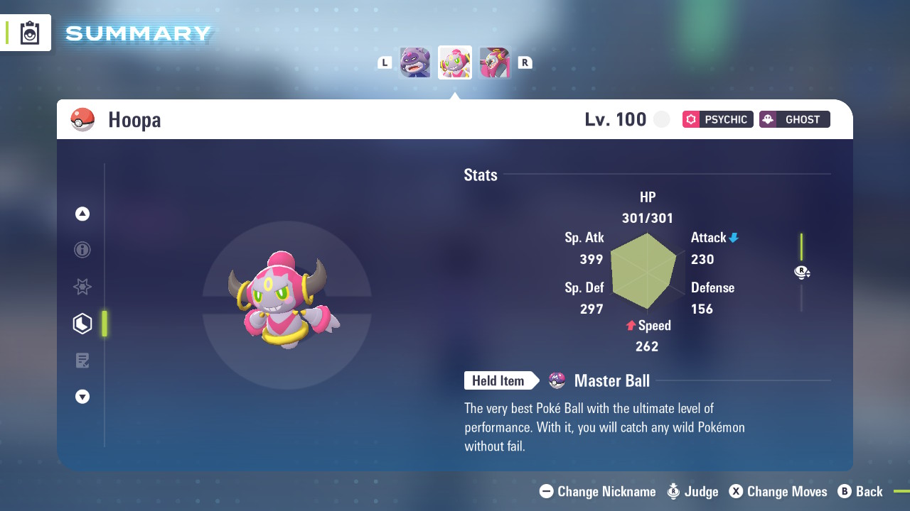 – Hoopa in unbound form – 6IV, Holding Master Ball.