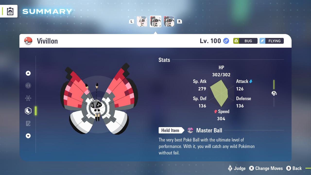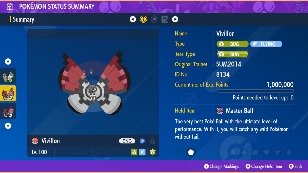 – Vivillon – Poké Ball Pattern (Shiny-locked – it will not be shiny) – 6IV, Holding Master Ball.