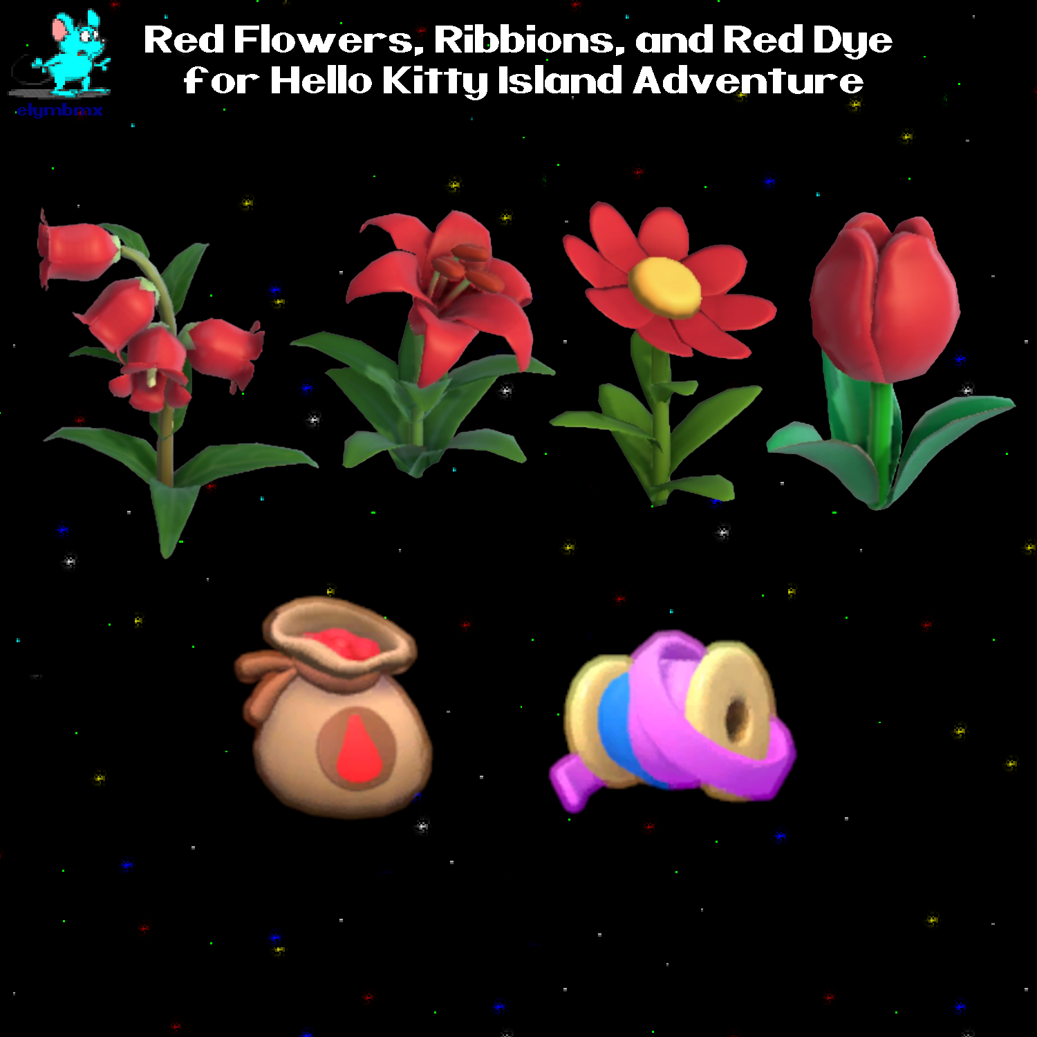 Red Flowers, Ribbons, and Red Dye for Hello Kitty Island Adventure