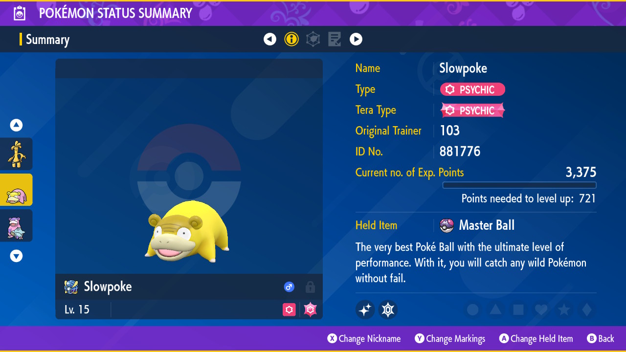 Shiny 6IV Galarian Slowpoke Pokemon with Master Ball Bundle for the games Pokemon Sword, Shield, Scarlet, Violet, and Legends Z-A versions.